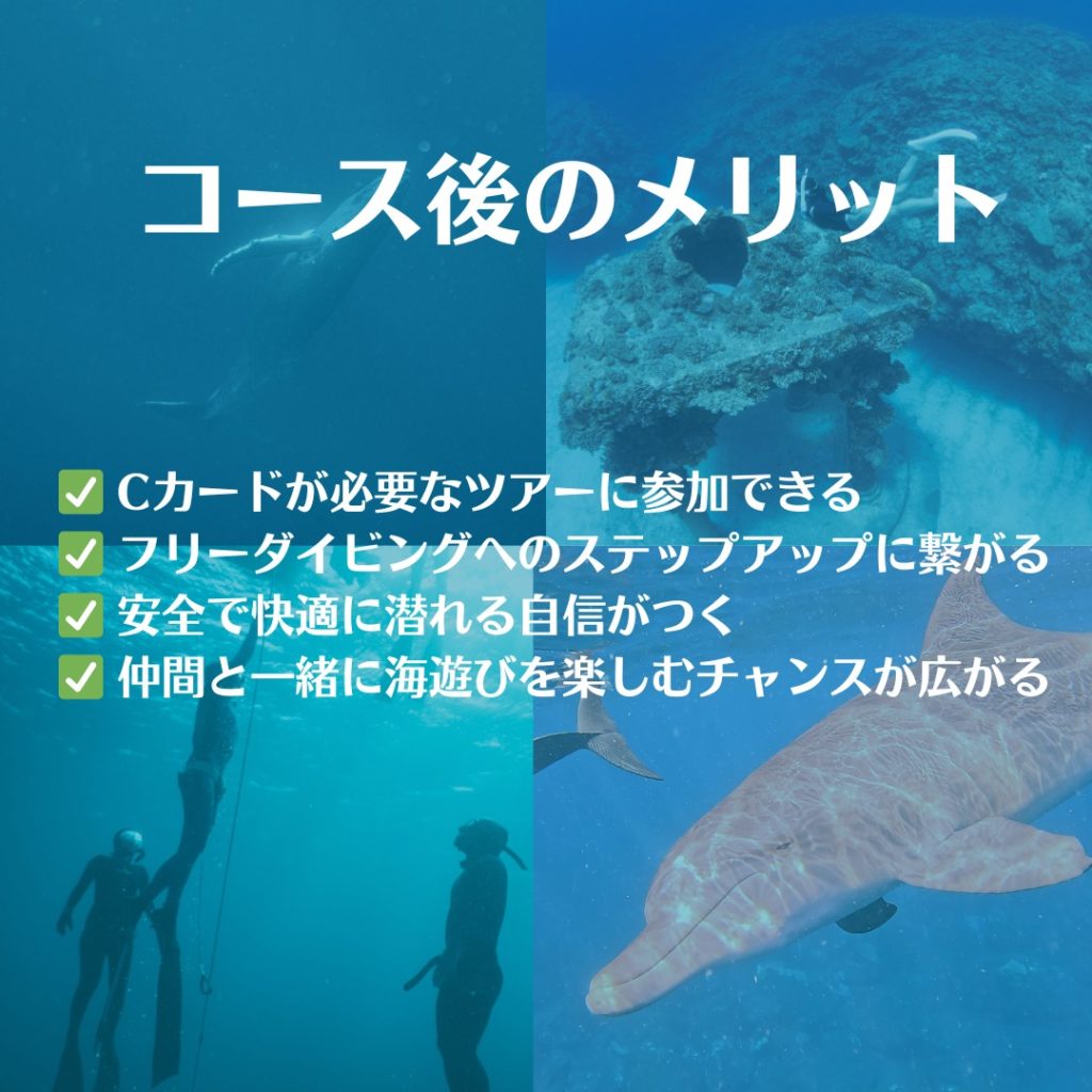 スキンダイビングはCカードがなくても楽しめますが、このコースなら 座学でしっかり学んでスキルアップ、さらにCカード取得も可能!難しい知識もわかりやすく、海で安全に楽しく潜る自信がつきます。